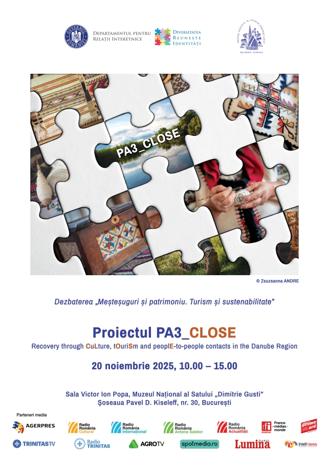 Departamentul pentru Relații lnteretnice – Guvernul României și Muzeul Național al Satului ,,Dimitrie Gusti” vă invită în data de 20 noiembrie 2025, de la ora 10.00 , la dezbaterea intitulată ,,Meșteșuguri și patrimoniu. Turism și sustenabilitate”, care va avea loc în Sala “Victor Ion Popa” din cadrul Muzeului Național al Satului “Dimitrie Gusti” (Soseaua Pavel D. Kiseleff, nr.28-30, Bucuresti).